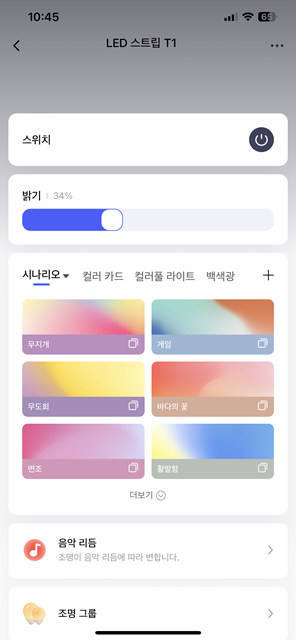 디바이스 카드의 메인 페이지에 보면은 스위치, 밝기 슬라이드, 시나리오, 음악리듬, 조명그룹 이렇게 설정할수 있습니다.